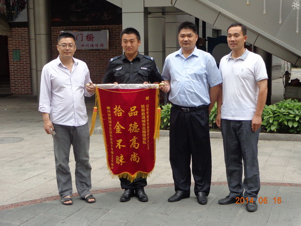 6月15日12點左右,華威保安揚州保安公司美食廣場項目部保安主管路標巡邏到廣場內(nèi)街時,發(fā)現(xiàn)凳子上有一個包,他左右看了看沒有人,又等了近半個小時,還是不見有人來取,他打開粗略一看,發(fā)現(xiàn)里面有現(xiàn)金,手機等貴重物品,他感到事情重大,及時撥打了110,并通知了物業(yè)馬經(jīng)理和管理部馬主任,等他們趕到后,當(dāng)場清點了里面的物品:現(xiàn)金6700余元,各種卡類15張,三星手機兩部。經(jīng)物業(yè)管理處多方查找得知,該失主是小區(qū)業(yè)主后,立即電話通知失主。當(dāng)問他是否丟過東西時,他卻不知道丟失物品,再次讓他們確認時,他老婆才恍然大悟說:“錢包丟了”。隨即趕到美食廣場,查看里面的東西全部都在,激動地說:“太謝謝保安同志了,要不是你們及時發(fā)現(xiàn),我的錢可能就保不住了,特別是里面的卡”。隨即拿出錢來表示感謝,被路標謝絕了,并說:“這是我們應(yīng)該做的”。